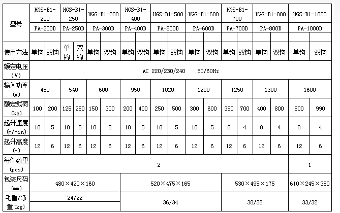 PA300D微型電動(dòng)葫蘆技術(shù)參數表: