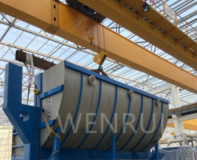 因為圓盤(pán)過(guò)濾機槽體部分重量達21噸、長(cháng)度11米,要倒放運輸,組裝時(shí)需翻轉吊裝客戶(hù)廠(chǎng)房的行車(chē)為25噸單鉤,吊裝風(fēng)險較大,制作單位根據豐富的施工經(jīng)驗,結合現場(chǎng)條件做出施工預案,征得客戶(hù)同意后,在行車(chē)梁上增加了兩臺鋼絲繩電動(dòng)葫蘆,利用提前附加的吊裝環(huán)實(shí)現了四點(diǎn)、兩線(xiàn)吊裝翻轉,保證了所有槽體部件安全就位。